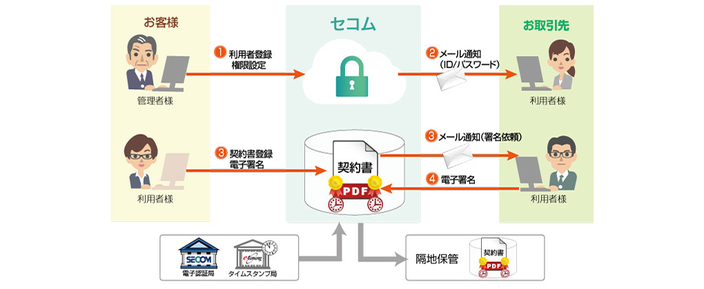 取引先との電子契約でも活躍。取引先側(契約の相手方)のサービス申し込みは不要で、お客さまにて契約の相手方のユーザー登録をしていただくことでサービスの利用が可能になります。