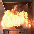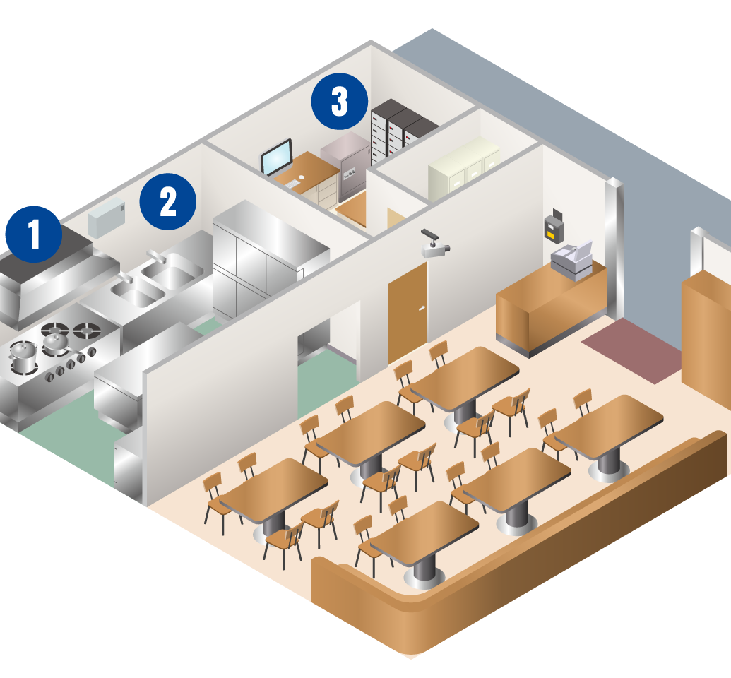 失火の危険性が高い厨房やダクト内の火災に備えて、自動消火システムを導入。万が一の際は、警告から消火までを自動で行います