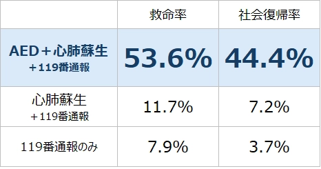 心停止の場合には一刻も早い胸骨圧迫とAEDの使用が求められており、胸骨圧迫とAEDを使用することで、119番通報のみと比べ救命率がおよそ6.8倍に上がるとされています。社会復帰率に至っては119番通報のみと比べるとおよそ12倍の差があり、AEDの使用が救命率および社会復帰率の向上に大きく影響していることは明らかです。