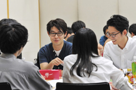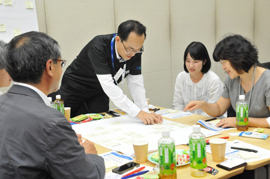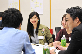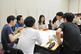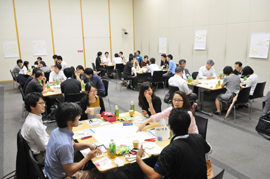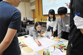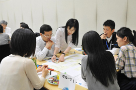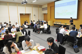 今回は、「デジタルネイティブ時代の安心感」というテーマにあわせて、新しい消費世代を代表して、東京理科大学と電気通信大学から、学部/大学院の学生にもご参加いただきました。こうした、世代や所属を超えた参加者が交わるためのアイスブレイクに、世代間のギャップを超える仕掛けとしてゲームを用意。テーブル内の交流を深めながら、チームビルディングを進めました。