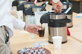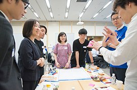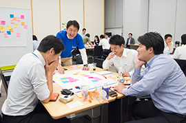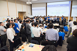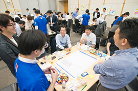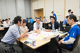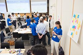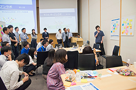 途中、コーヒーブレイクタイムには、ワールドカフェよろしく参加者が大きく移動して他グループとの交流も交えながら、マッシュアップを進めます。