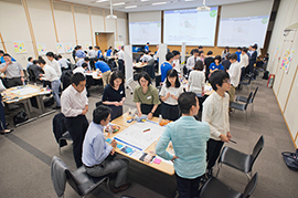 今回は、「Workplace2030:オフィスの未来」と題して、様々な企業の新事業担当者や総務系人事系のワークスタイル担当といった産業界の参加者と一部学生の参加者も交えて、多様な業種・業界のワーク環境をベースに約90名でアイデアディスカッションを開催しました。