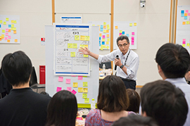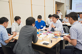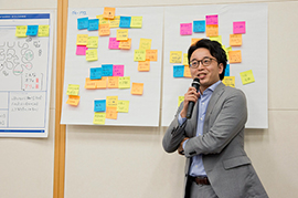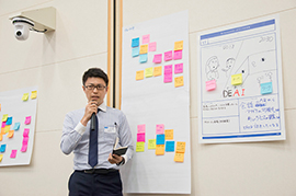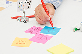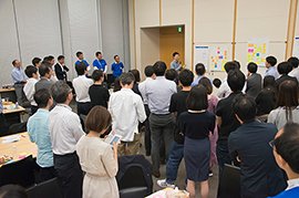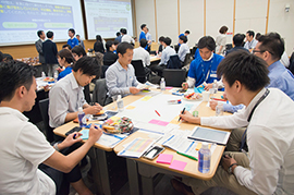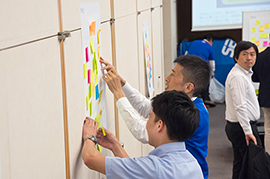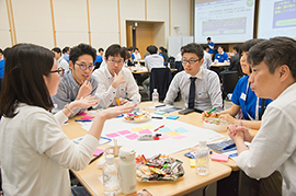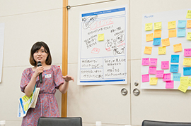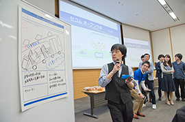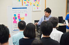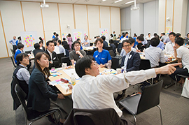 ワーク後には、グループごとに大判のアイデア整理シートに各テーブル内での議論をマッピングしていき、その成果を発表して参加者全員でシェア。