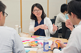 ワークの前半戦は、課題探索の時間帯です。オフィスに変化が迫られるわけ、オフィスに不足している機能·人·物·情報·環境について、それぞれの視座から課題を挙げて発散させながら議論が促されます。コワーキングスペース、シェアオフィス、リモートワークなど現在提案されているオフィス像を一度疑ってみながら、オフィスを巡るトレンドの変化、環境の変化について、普段感じているもやもや感など非言語的なメッセージを言語化し、可視化していきました。
