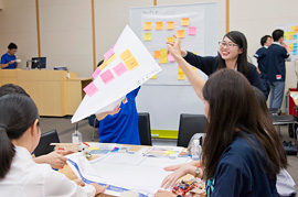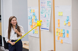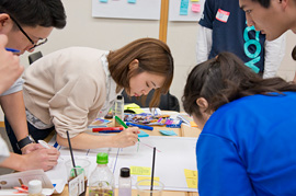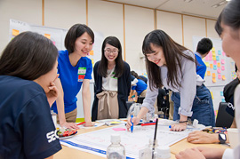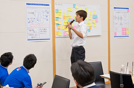 コーヒーブレイクを挟んだ後のワークショップ後半戦では、前半で各々見出した不便さや課題感を参考にしながら、グループ毎に描く、既存の価値観を飛び越えた、これからの時代にふさわしいアイデアを提案。今までの「あたりまえ」を覆し新たな価値を生み出すサービスや、今現在多くの人が抱える不満を解消する仕組みなど、価値観や課題、その裏にあるそれぞれの想いを紐解きながら、よりよい未来の社会に繋がるアイデアに議論が展開されました。