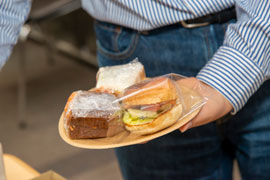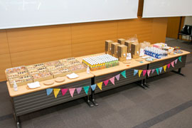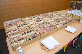 今回の軽食には、テーマである「タイパ」というキーワードにあわせて、栄養素とおいしさのバランスが整った日清食品の「完全メシ グリーンスムージー」「完全メシ バナナスムージー」や、作業をしながら片手で食べることができるミニサンドイッチやミニバーガーなどを多数ご用意。コミュニケーションが進む議論の場を演出しました。