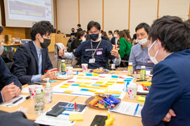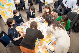 続くワークショップでは、48企業/官庁や大学から約100名の参加者が、14グループに分かれてそれぞれの視座からディスカッション。ワークタイムを細かく区切り、議題を変えながら、フィルター化とタイパが求められる背景、メリット、デメリットについて、様々な視座・価値観・専門性により議論が展開されました。日々のお困りごとや感情の変化を可視化しつつ、これから必要になってくる新たなニーズをもとにアイデア提案へと昇華させるアプローチです。