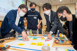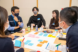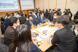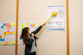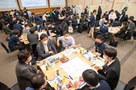 ワークショップ後には、大判のアイデア整理シートに各テーブル内での議論と提案アイデアをまとめ、その成果を発表して参加者全員でシェア。ふんだんなイラストとキャッチーなフレーズで参加者の心を掴みます。